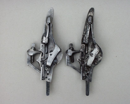 Vergleich der Schlösser von außen. Rechts das Original. Dieses mußte bereits eine korrosionsbedingte und nicht unerhebliche Aufrauhung der Oberfläche hinnehmen. Zudem zeigt die Hahnfeder, welche normalerweise bei aufgeklapptem Hahn einen ziemlich kräftigen Druck auf den Pfannenschieber ausübt, altersbedingte Ermüdungserscheinungen.