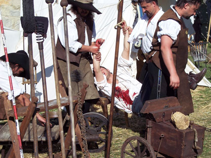 | Auch die Belagerer hatten erhebliche Verluste zu beklagen, wobei die bedauerlichen Verwundeten keine zimperliche Behandlung zu erwarten hatten und in den seltensten Fällen mit dem Leben davonkamen (Hier beim Kugelziehen im Feldlager des Hortus Bellicus). |