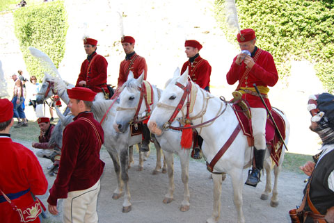 Die ungarische Reitertruppe "Salföldi Kopjasók" hatte ihr Lager mitsamt den weißen Araberschimmeln ebenfalls im äußeren Wallgraben aufgeschlagen. Auch diese Gruppe repräsentierte ein ungarisches Husarenregiment, allerdings etwas modernerer Prägung (Anfang 18. Jahrhundert). Obwohl nicht ganz so authentisch und farbenfroh ausgestattet, wie die Fußtruppe Bethlen Gabor, waren sie natürlich aufgrund ihrer prächtigen Schimmel und spektakulären Reiterdarbietungen der absolute Publikumsfavorit. Schade, daß gerade am Pfingsmontag eine Vorstellung zwecks Schonung der Pferde vor dem Transport ausfallen mußte.